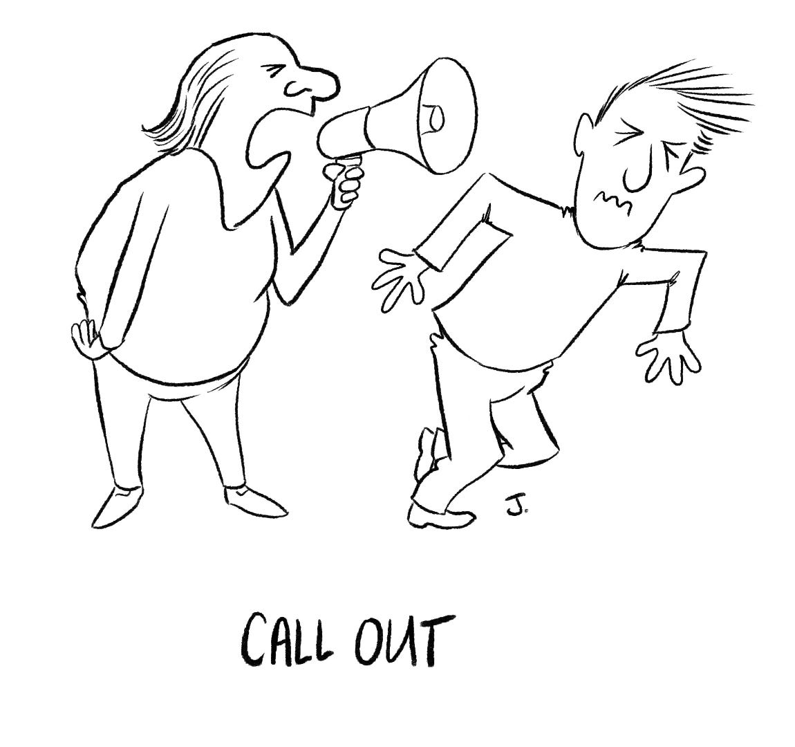 Historically, someone was ‘called out’ to perform a simple action. For example, it used to be common to ‘call out’ a plumber to fix a leaking pipe. In recent times, we have seen a revival of the once popular tradition of public denunciation. ‘Calling’ someone ‘out’ has become an effective way for aggrieved people to denounce an opponent, without the cumbersome task of detailing their accusation. By performing this task in public, the subject of the ‘call out’ is answerable to an audience who acts on the accuser’s behalf. The subject is unable to defend themselves, through logic or argument, and is forced to seek redemption through a public display of contrition, issuing an apology and expressing the intention to ‘seek help’. This simultaneously establishes the accusers moral authority, creates an appreciative crowd and saves time.
